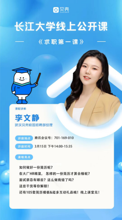 (通讯员 余珺瑞)2022年3月15日14:00,武汉贝壳找房科技有限公司校园招聘经理李文静受邀在腾讯会议为Welcome威尼斯在线登录学生开展就业指导讲座,我院2018级近四百名学生参加。