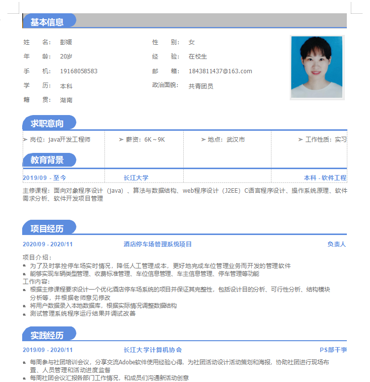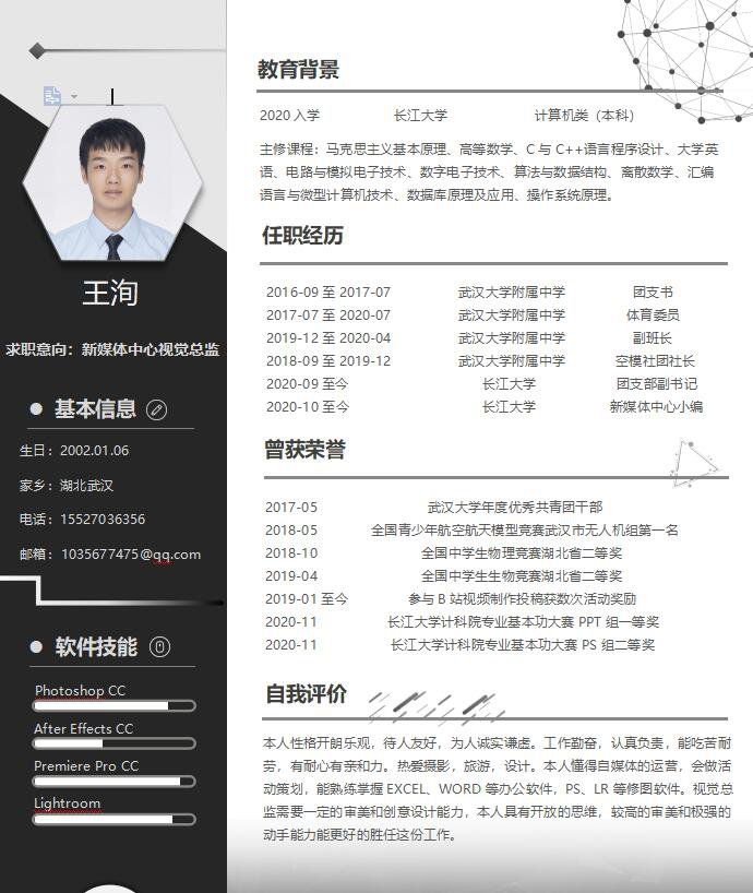 模板新颖,界面清爽,条理层次清新,求职意向与任职经历及最后两项荣誉相关,是一份较为优秀的简历。该模板比较适合男生。