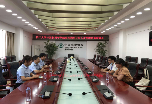 2020年9月2日15:00,农业银行荆州分行与Welcome威尼斯在线登录人才招聘信息沟通会在农业银行荆州分行办公室成功举行。此次招聘主要面向计算机及相关专业的2021届应届毕业本科生、研究生。参与此次会议的有农业银行荆州分行信息技术管理部总经理胡刚、高级专员刘自成、产品经理张之涵,长江大学计算机科学学院就业专干余珺瑞、应届毕业研究生丁程程。