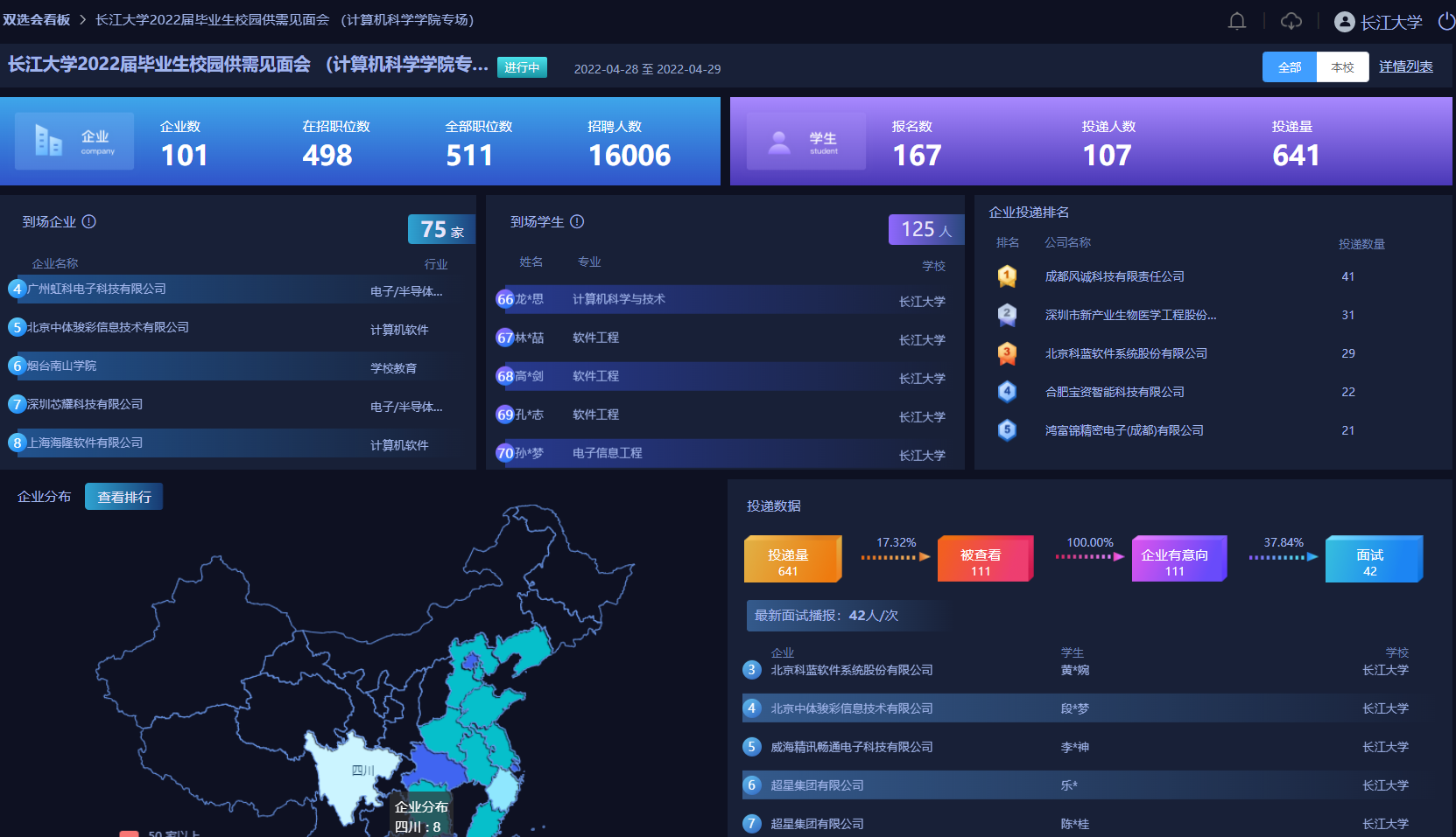 长江大学2022届毕业生春季校园招聘会(计科类专场),采用全线上模式,是疫情形势下对于就业工作新形式的探索。学生、企业反响较好,能够较好解决企业招聘难、学生求职难,以及疫情情况下线下招聘难的问题,也为下一步就业工作做出了良好的榜样和探索,是一次较为成功招聘会。