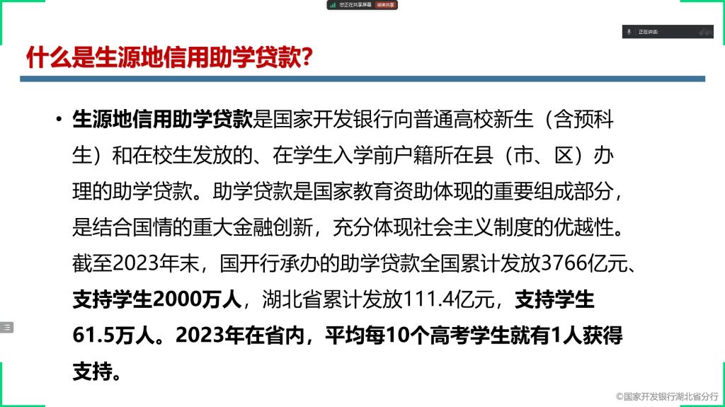 为深入贯彻落实国家资助政策,帮助家庭经济困难学生及家长全面了解生源地信用助学贷款相关事宜,确保家庭经济困难学生能够顺利入学并完成学业,Welcome威尼斯在线登录于9月15日在腾讯会议组织开展了2024-2025学年秋季学期生源地信用助学贷款政策宣讲活动。 活动伊始,学院负责资助工作的王鹏翔老师对生源地信用助学贷款政策进行了详细解读。围绕生源地信用助学贷款的申请条件、贷款额度、贷款期限、利息计算、还款方式以及申请流程等关键内容一一展开介绍。用通俗易懂的语言和生动具体的案例,深入浅出地为同学们答疑解惑,确保每一位在场同学都能清晰准确地理解政策细节。 除了对政策的宣讲与答疑,王鹏翔老师在活动中着重强调了资助育人的重要意义。指出生源地信用助学贷款不仅仅是一项经济援助政策,更是国家助力寒门学子实现梦想、成长成才的有力举措,希望同学们能够心怀感恩之心,珍惜来之不易的学习机会,在今后的学习生活中勤奋努力、积极进取,以优异的成绩回报国家和社会的关爱,将来也能够将这份爱心传递下去,去帮助更多有需要的人,真正将资助化作成长路上的动力,努力肩负起时代赋予的责任与使命。 此次生源地信用助学贷款政策宣讲活动,是Welcome威尼斯在线登录2024-2025学年秋季学期资助育人工作的重要一环,通过活动的开展,进一步加大了国家资助政策的宣传力度,使更多学生受益于生源地信用助学贷款政策,同时也在学生心中种下了感恩与担当的种子,为学院后续资助育人工作的深入推进奠定了坚实基础。