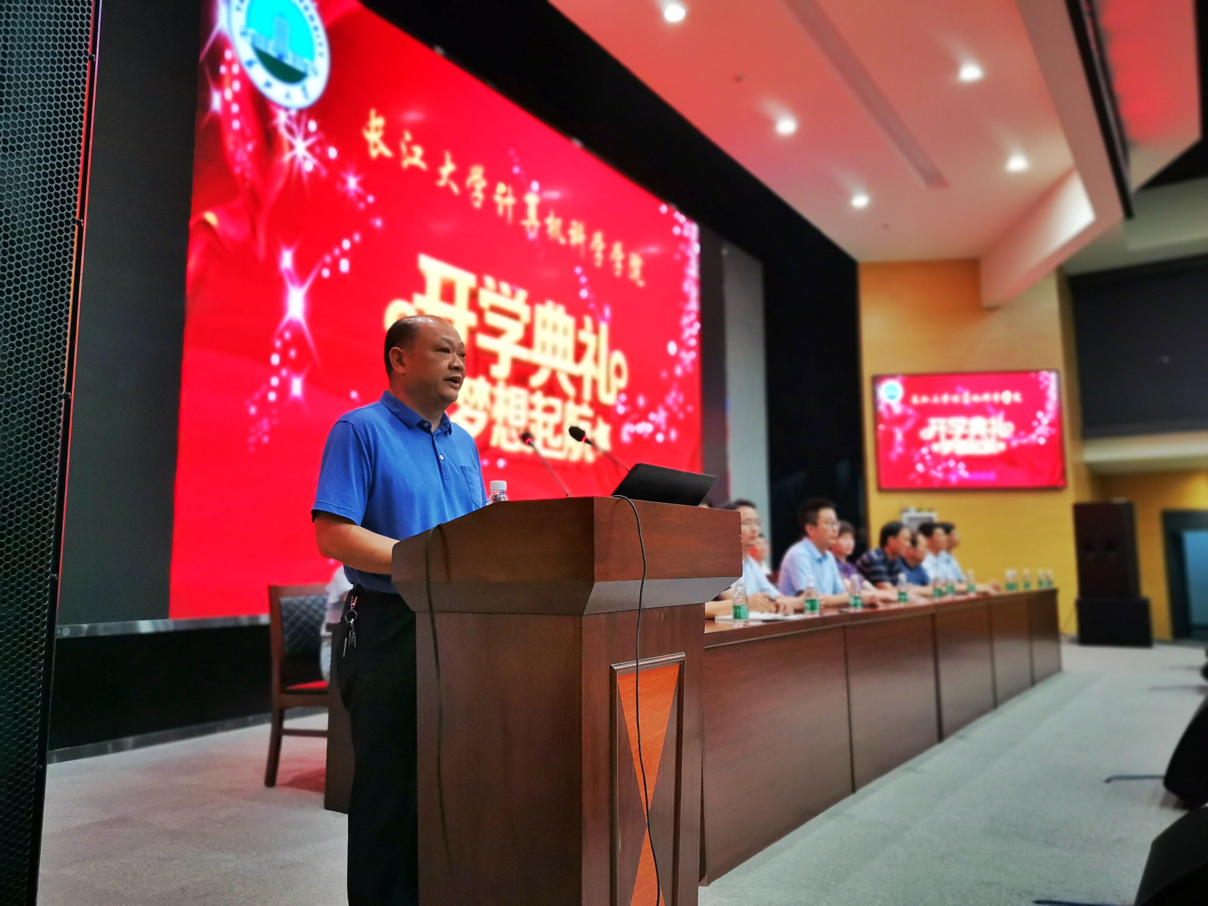 教师代表雷鸣老师根据时代的发展与变迁,从计算机相关专业的起源说起,分析了行业的实际情况,进而描绘了大好的未来发展前景。他以“敬业、专业、理想、梦想、责任、担当”这六个词语结尾,既是对新生们的声声告诫,也是对在座未来计科学院栋梁人才的美好希冀。
