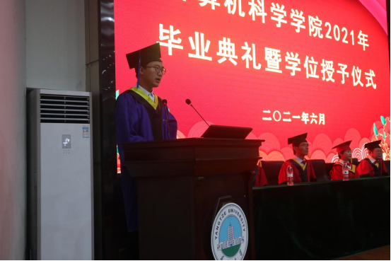 随后,学院本科生、研究生毕业代表依次上台发言。董阿兵谈到了这四年来大家的进步:我们努力践行“长大长新”的校训,学会了去求知,去探索,去宽容,不断超越,不断成长;卞珍怡回顾了在校历程,并深深地感谢父母、感谢导师、感谢同学;胡月像论文一样给自己三年的时光添加了两个关键词—“不舍”、“感激”,表达了自己对母校深深的眷念之情。