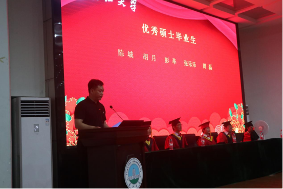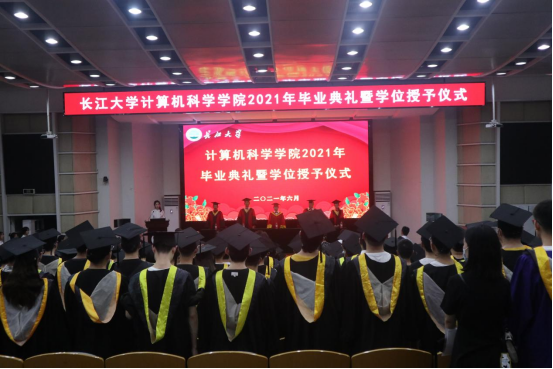 伴随着温馨的暖场视频,典礼正式开始,全体成员起立奏唱国歌。学院党委副书记颜学俊宣读了2021届优秀毕业生表彰文件,今年学院共有24名本科生和5名研究生被评为“长江大学优秀毕业生”。