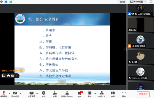 (通讯员:张颖旭)为切实做好常态化疫情防控下的2021年秋季新生开学教育工作,帮助和引导新生全面了解学校及学院的整体防控工作,2021年8月22日晚19:00,Welcome威尼斯在线登录利用腾讯会议(分两个会场),召开以“梦想起航,安全至上”为主题的安全教育班会。参加此次会议的有Welcome威尼斯在线登录党委副书记颜学俊、21级辅导员张颖旭、兼职辅导员高小梅、新生班级班主任、21级全体新生及部分新生家长。