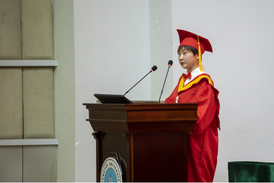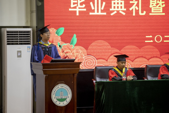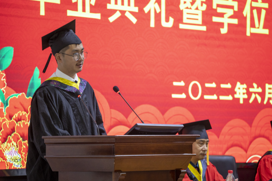 随后,学院本科生、研究生毕业代表依次上台发言。李志昂同学深深地感谢老师们的教诲和同学们的陪伴,并对学院未来的发展抱有很大期许;叶星妤同学分享了自身学习经历,并表示要不负青春,不负韶华,珍惜在校的每一寸光阴;张智亮同学对老师们给予最高的敬意与最诚挚的祝福,表达了对母校的不舍之情。