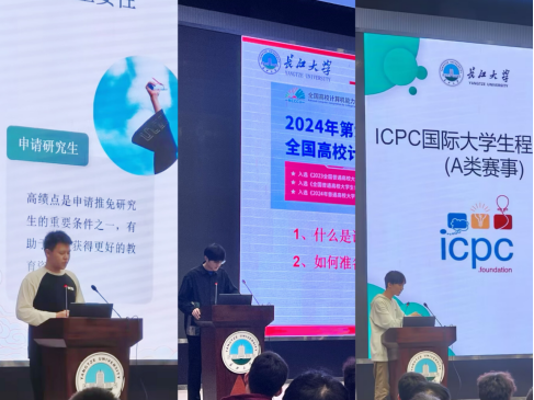 接着,老生代表们依次发言。计科12104班王鑫锐介绍了本科生涯规划,特别强调了绩点的重要性,为新生们树立了努力学习的目标。2023级研究生赵怡帆详细介绍了计算机能力挑战赛的准备方法,让新生们对赛事有了更清晰的认识。计科12305班纪方嘉则分享了程序设计竞赛的相关经验,激励新生们积极参与竞赛,提升自己的专业技能。