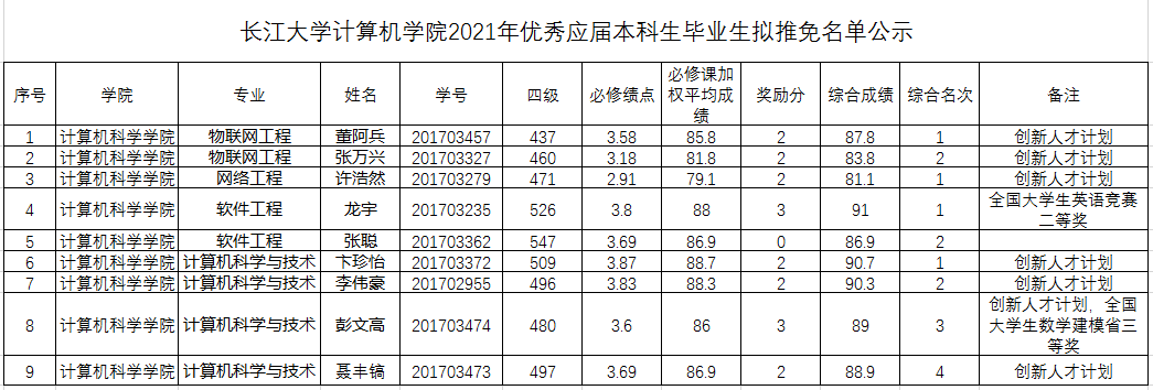 按照教务处《关于做好推荐2021届优秀本科毕业生免试攻读硕士学位研究生工作的通知》具体安排,依据《长江大学推荐优秀应届本科毕业生免试攻读硕士学位研究生管理办法(试行)》(长大校发 〔2020〕106号)等文件规定,结合学院实际Welcome威尼斯在线登录组织了2021届优秀本科毕业生免试攻读硕士学位研究生推荐工作。经学生个人申报,学院及学校相关单位审核,综合必修课加权平均成绩和奖励加分,经我院院长办公会讨论通过,现将推荐结果公示如下: